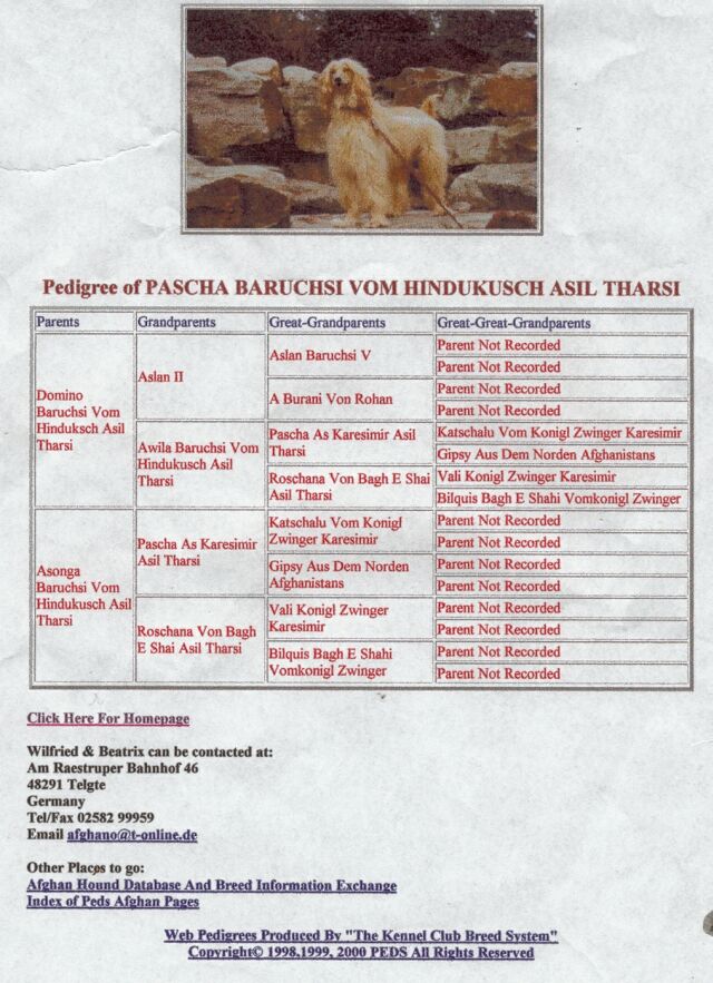 Pascha kam mit der Familie Vendolsky in den 1970ern aus Kabul nach Deutschland. Er wurde mit V-angekört und mit A Nummer ins DWZRV Zuchtbuch eingetragen,